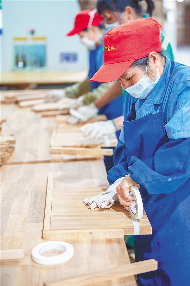 在寶聯林產公司生產車間,機器聲轟鳴不斷,工人們身著制服、戴著口罩,一塊塊木板胚料在他們手中經過一道道精細的工序,成為大小均等、色澤相近的木地板條。