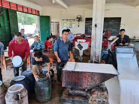 在龍江分公司雄英2隊(duì)收膠站,膠農(nóng)們前來(lái)賣膠水。袁國(guó)華 攝