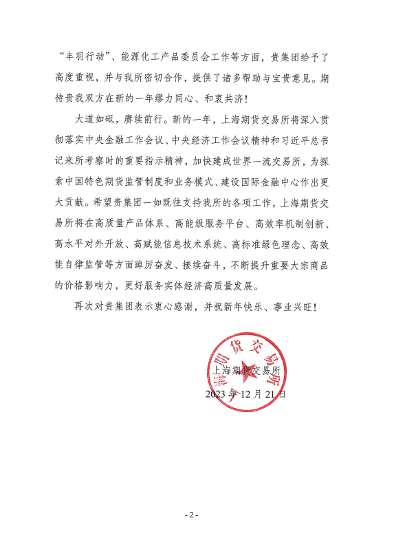 近日,海南橡膠收到一封來自上海期貨交易所的感謝信,信中對海南橡膠在天然橡膠期貨功能發揮、產融服務基地建設、20號膠期貨“豐羽行動”、能源化工產品委員會工作等方面給予的高度重視和支持表示感謝。