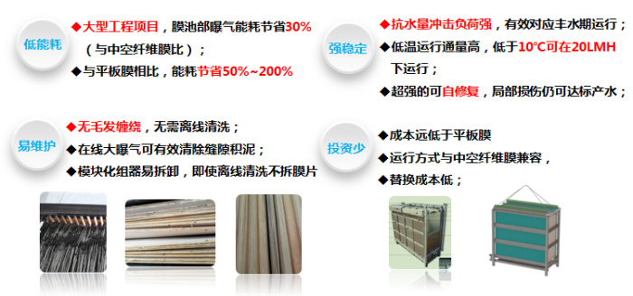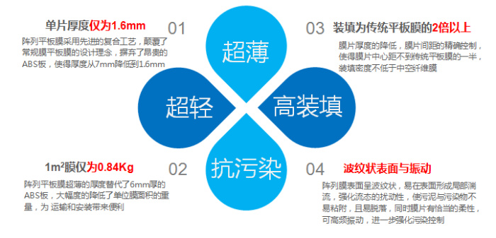 (2)組件結構緊湊,裝填面積高,裝填比傳統平板膜提高 200%以上,能耗小于 傳統平板膜的 50%,甚至更低;