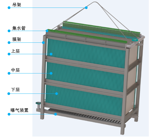 (9)膜組器的獨特結構設計,充分強化了水力學循環,提高水力對膜表面的擦洗 效率,同時提高氧氣的利用率;